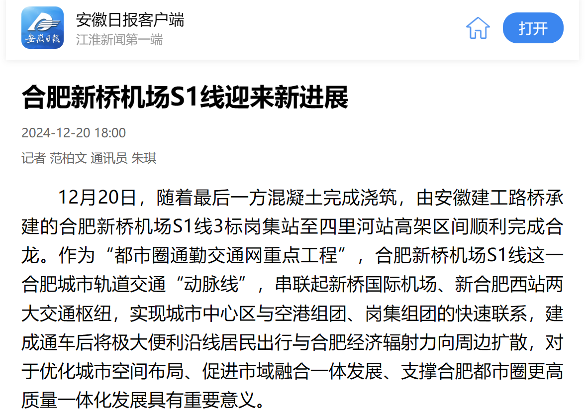 【名媒聚焦】央廣網(wǎng)、安徽日報、中安在線等主流媒體聚焦報道合肥新橋機(jī)場S1線3標(biāo)崗四高架區(qū)間橋梁合龍