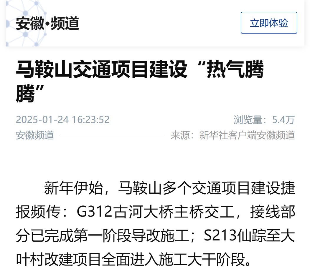 新年伊始,馬鞍山多個交通項目建設(shè)捷報頻傳:G312古河大橋主橋交工,接線部分已完成第一階段導(dǎo)改施工;S213仙蹤至大葉村改建項目全面進(jìn)入施工大干階段。
