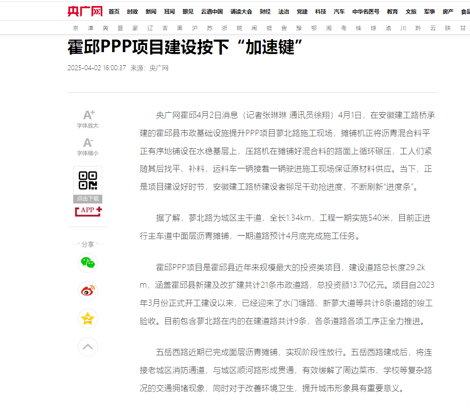 【名媒聚焦】央廣網(wǎng)、安徽日報(bào):安徽建工路橋霍邱PPP項(xiàng)目建設(shè)按下“加速鍵”