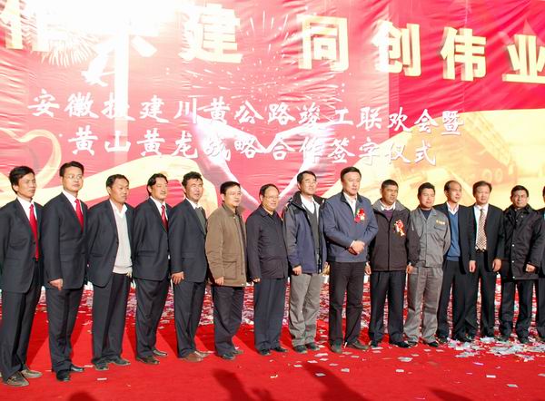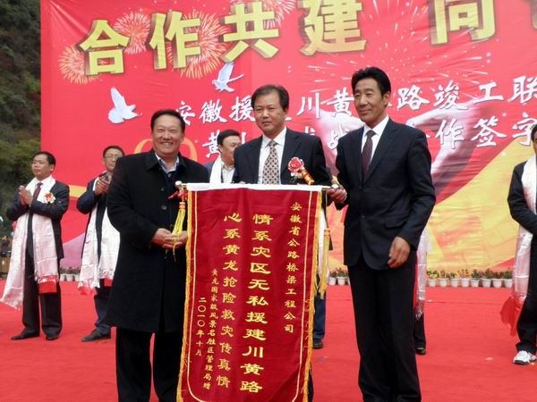 十月的松潘,金風(fēng)送爽,喜事連連。10月14日,安徽援建川黃公路竣工聯(lián)歡會(huì)暨黃山黃龍戰(zhàn)略合作簽字儀式在美麗的黃龍風(fēng)景區(qū)廣場(chǎng)隆重舉行。安徽省政府秘書長(zhǎng)梁衛(wèi)國(guó)、省交通廳副廳長(zhǎng)丁慶領(lǐng)及四川省、阿壩州、松潘縣各級(jí)領(lǐng)導(dǎo)出席儀式。我公司總經(jīng)理汪衛(wèi)東、黨委書記陳光磊以及漳黃02標(biāo)項(xiàng)目經(jīng)理陳莘同志作為特邀嘉賓出席典禮。這標(biāo)志著我安徽路橋?qū)谥г膳苏狞S公路建設(shè)任務(wù)的圓滿完成。