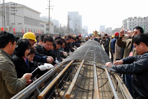 項目辦負(fù)責(zé)人向?qū)W員們簡單介紹了工程概況。學(xué)員們在工人師傅的指導(dǎo)下,紛紛戴上手套、拿起工具,給已成型的樁基鋼筋籠綁扎鋼絲,親身體驗了建設(shè)者的辛勞。學(xué)員們虛心向工人師傅學(xué)習(xí),緊圍著鋼筋籠,一邊認(rèn)真扎絲,一邊相互交流,探討綁扎技巧。在學(xué)員們的巧手下,兩個鋼筋籠很快完成綁扎,將用于晚間施工。