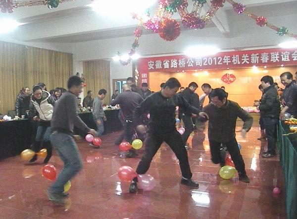聯(lián)歡會(huì)上,公司黨委書記陳光磊致新年賀詞,祝所有員工節(jié)日快樂(lè)。本次聯(lián)歡會(huì)把公司領(lǐng)導(dǎo)和機(jī)關(guān)員工分成四個(gè)代表隊(duì)進(jìn)行游戲,每個(gè)游戲根據(jù)結(jié)果評(píng)定得分,所有游戲結(jié)束后,根據(jù)得分多少評(píng)定獎(jiǎng)項(xiàng)。
