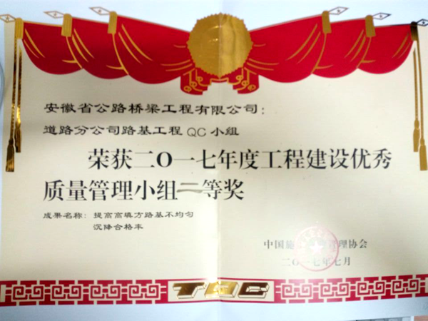 近日,在中國施工企業(yè)協(xié)會2017年度全國工程建設質量QC小組成果發(fā)布暨評審會上,由道路分公司QC小組選送的《提高高填方路基不均勻沉降合格率》成果,從全國千余個QC成果中脫穎而出,以優(yōu)異的成績榮獲2017年度工程建設優(yōu)秀質量管理小組成果二等獎,為公司贏得了榮譽。