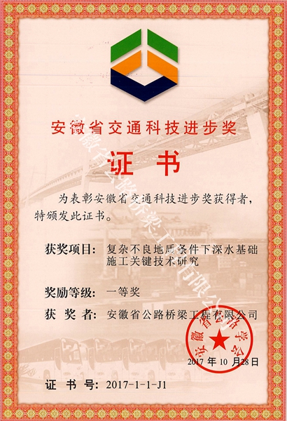 《復雜不良地質(zhì)條件下深水基礎施工關鍵技術研究》是以濟祁淮河特大橋基礎施工為背景,深入研究了樁基施工到圍堰施工一體系成套基礎施工關鍵技術,創(chuàng)新式的改進結構及施工工藝使得體系結構受力合理。該施工技術及理論從實踐中總結得出,并在項目施工中成功驗證。2017年7月,經(jīng)中國公路建設行業(yè)協(xié)會組織的專家鑒定,該技術成果達到國際先進水平。《大曲率鋼橋面鋪裝雙層高粘SMA瀝青瑪蹄脂碎石施工技術》重點對大曲率鋼橋的安裝施工方法進行了描述,同時橋面鋪裝施工首次采用基質(zhì)瀝青添加直投式RST高粘瀝青改性劑,采用特殊的礦料級配,結合靜態(tài)碾壓工藝,成功解決了鋼橋面變形性能導致的壓實度不易控制的難題,有效提高了施工質(zhì)量。2017年7月,經(jīng)專家鑒定,該技術成果達到國內(nèi)先進水平。