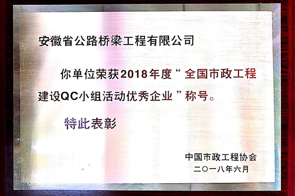 6月23日,2018年度全國市政工程建設優(yōu)秀QC小組成果發(fā)布及表彰會在昆明召開,由市政分公司組織選送的六項成果全部獲獎,公司榮獲2018年度“全國市政工程建設QC小組活動優(yōu)秀企業(yè)”榮譽稱號。