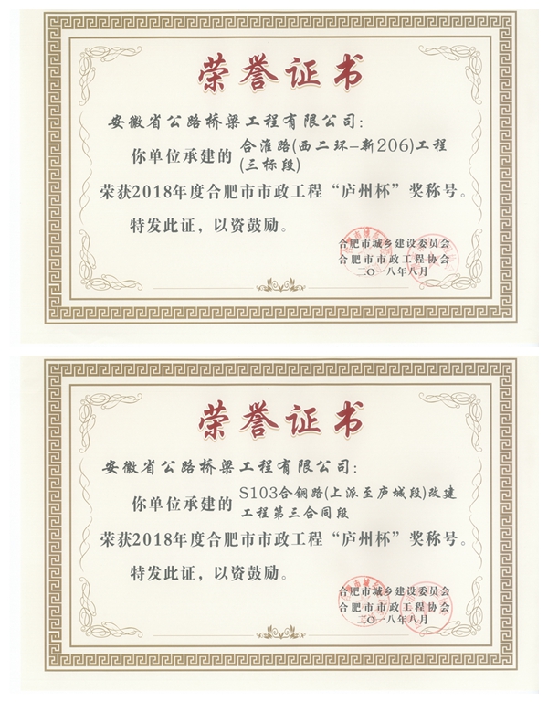 近日,從合肥市市政工程協會傳來喜訊,安徽路橋公司承建的S103合銅路(上派至廬城段)改建工程、合淮路(西二環(huán)-新206)三標兩項工程經合肥城鄉(xiāng)建委審定,榮獲2018年度合肥市政工程“廬州杯”獎。
