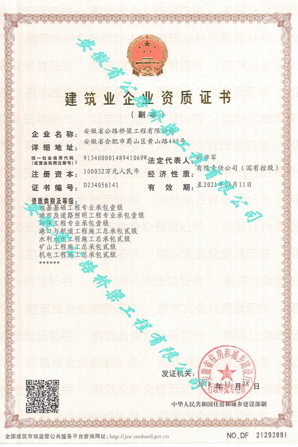 11月28日,公司地基基礎(chǔ)工程專業(yè)承包壹級、城市道路照明工程專業(yè)承包壹級、礦山工程施工總承包貳級三項資質(zhì)順利通過安徽省住房和城鄉(xiāng)建設(shè)廳審查核準(zhǔn)。