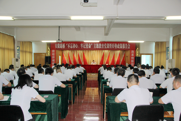 為進(jìn)一步推深做實“不忘初心、牢記使命”主題教育,按照公司主題教育方案部署,8月2日下午,股份公司副總經(jīng)理、公司黨委書記、董事長孫學(xué)軍以“守初心 擔(dān)使命 找差距 抓落實——用習(xí)近平新時代中國特色社會主義思想指導(dǎo)打造品質(zhì)路橋卓越路橋”為主題,作了一場主題教育黨課暨形勢政策報告會。集團(tuán)主題教育第四指導(dǎo)組副組長王永來到會指導(dǎo)。公司領(lǐng)導(dǎo),中層干部,在肥項目經(jīng)理、黨支部負(fù)責(zé)人,機關(guān)全體黨員100余人參加了報告會。