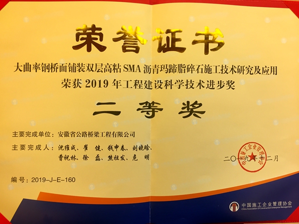 近日,2019年中國施工企業(yè)管理協(xié)會工程建設(shè)科學技術(shù)獎勵大會在天津召開,公司主持的課題成果“大曲率鋼橋面鋪裝雙層高粘SMA瀝青瑪蹄脂碎石施工技術(shù)”經(jīng)過專家評審,榮獲二等獎。