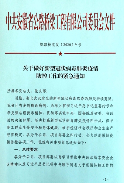 1月27日,公司黨委發(fā)布《關(guān)于做好新型冠狀病毒肺炎疫情防控工作的緊急通知》,對公司疫情防控工作進(jìn)行具體部署,要求各分子公司、項(xiàng)目部立即行動,全力以赴做好疫情防控工作。同步組織成立公司疫情防控工作領(lǐng)導(dǎo)小組,由主要負(fù)責(zé)人擔(dān)任組長,統(tǒng)籌負(fù)責(zé)公司疫情防控指揮、協(xié)調(diào)工作;同時,所屬各生產(chǎn)單位也組織成立了疫情防控工作領(lǐng)導(dǎo)小組,全面加強(qiáng)對新型肺炎疫情防控工作的領(lǐng)導(dǎo)。實(shí)行領(lǐng)導(dǎo)班子成員輪流帶班制度,實(shí)時做好疫情防控指揮;建立疫情防控工作群,加強(qiáng)信息溝通和日常工作調(diào)度;各項(xiàng)目明確聯(lián)絡(luò)員,對疫情防控信息每日進(jìn)行報告。