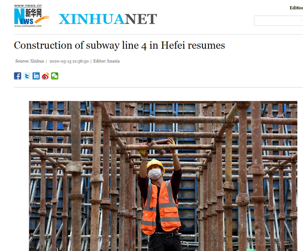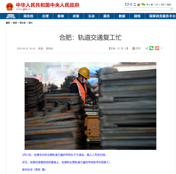 近日,中華人民共和國中央人民政府官方網(wǎng)站、新華社同時以《合肥軌道交通復工忙》為題,報道了公司承建的合肥軌道交通4號線長寧大道站復工復產(chǎn)情況,用8張圖片展現(xiàn)了現(xiàn)場全面復工復產(chǎn)后的施工場景。