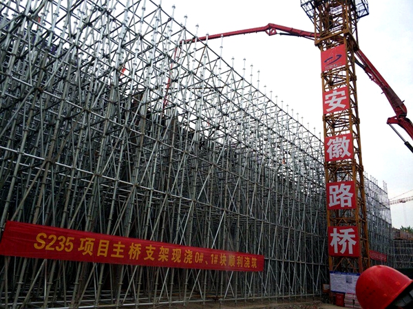 為突破原有施工方案對工程進(jìn)度的瓶頸制約,項目部多方聯(lián)系,充分論證優(yōu)化方案,一方面,將主橋原定的碗扣支架改為盤扣支架施工,大大加快了搭拆速度,提高了質(zhì)量與安全,有效節(jié)約了成本。另一方面,將原先的半幅現(xiàn)澆調(diào)整為全幅現(xiàn)澆方案,有效縮短了工期。