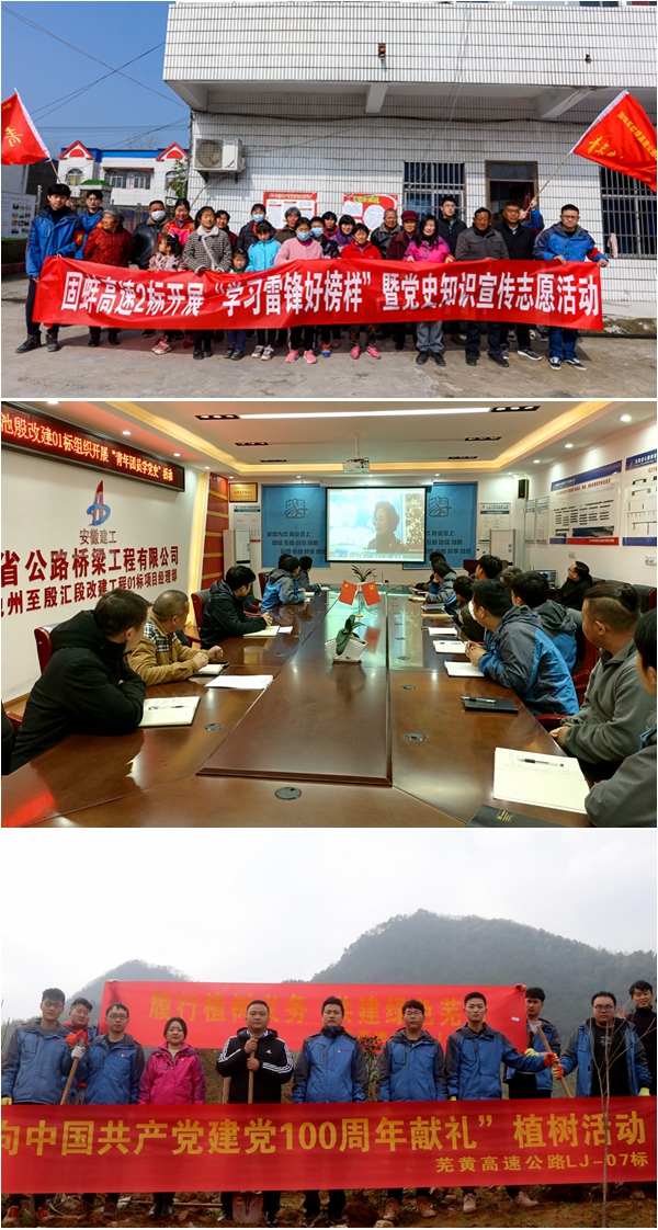道路分公司、環(huán)通公司、租賃公司結(jié)合學(xué)雷鋒志愿者服務(wù)月活動(dòng),組織開展“團(tuán)員青年學(xué)黨史”活動(dòng)。固蚌02標(biāo)開展“學(xué)習(xí)雷鋒好榜樣”暨黨史知識(shí)宣傳志愿活動(dòng),G318池殷改建01標(biāo)組織青年團(tuán)員開展“學(xué)黨史、學(xué)雷鋒”主題學(xué)習(xí)會(huì),把學(xué)黨史成效轉(zhuǎn)換為志愿服務(wù)具體實(shí)踐。