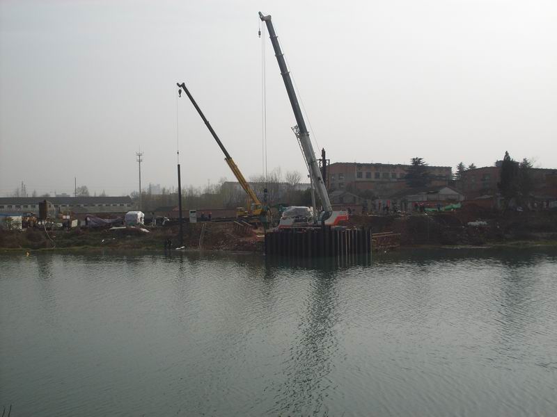 淠望路大橋作為市政工程具有工期緊、任務(wù)重、技術(shù)難度大的特點(diǎn),但經(jīng)項(xiàng)目部領(lǐng)導(dǎo)精心組織、科學(xué)部署,加大人力與設(shè)備的投入,自2月1日進(jìn)場開工以來,全部90根挖孔樁已開挖41根,累計(jì)深度270m;于2月18日開始進(jìn)行關(guān)鍵工序——主墩右幅鋼板樁圍堰施工。由于淠史杭干渠承擔(dān)皖豫兩省14個(gè)縣(區(qū))的春耕灌溉任務(wù),六安市重點(diǎn)辦要求加快施工進(jìn)度,必須在4月15日完成所有水下工程及用于水面以上施工的支撐等,并于4月25日前完成圍堰拆除清理工作。項(xiàng)目部立即召開緊急動(dòng)員會(huì),號(hào)召全體技術(shù)人員克服一切困難和挑戰(zhàn),堅(jiān)決完成上級交代的任務(wù),并立即組織技術(shù)人員根據(jù)鋼板樁長度、水深、地質(zhì)、承臺(tái)埋置深度等情況,制定了科學(xué)的施工技術(shù)方案、成立了以項(xiàng)目部經(jīng)理、副經(jīng)理為組長的安全領(lǐng)導(dǎo)小組。施工所用的T90振動(dòng)錘、70t吊車、25t吊車、PC200挖機(jī)、 T100推土機(jī)、ZLM50裝載機(jī)、自卸車等重型機(jī)械設(shè)備陸續(xù)開進(jìn)施工現(xiàn)場。