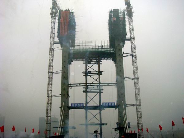 作為整座大橋的控制性工程,主索塔施工一直是各方關(guān)注的焦點(diǎn),并成為影響我項(xiàng)目總體施工進(jìn)度的主要因素。為此,項(xiàng)目部領(lǐng)導(dǎo)班子經(jīng)過(guò)多次研究分析并大膽決策,決定改變以前多點(diǎn)開(kāi)花,齊頭并進(jìn)的工作方向,將工作重心向主索塔偏移,從人員到設(shè)備優(yōu)先滿足主索塔的施工需要。針對(duì)施工過(guò)程中遇到的技術(shù)難題,項(xiàng)目部及時(shí)邀請(qǐng)有關(guān)專(zhuān)家及公司領(lǐng)導(dǎo)到施工現(xiàn)場(chǎng)指導(dǎo),制定解決方案。在積極趕超進(jìn)度的同時(shí),項(xiàng)目部將安全和質(zhì)量擺放在首要位置。在施工過(guò)程中,項(xiàng)目部不僅建立了完善的安全、質(zhì)量保障體系,更積極增加投入,全方位確保主索塔施工質(zhì)量,并使主索塔施工速度得到穩(wěn)步提升。