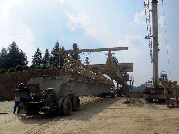 為確保架梁施工安全,我部精心制訂施工方案。同時,在架梁機(jī)械驗(yàn)收合格后多次對其進(jìn)行檢查,對作業(yè)人員進(jìn)行班前教育,做好交底,制定應(yīng)急預(yù)案,保證了整個架梁過程安全、高效。隨著架橋機(jī)有節(jié)奏的完成一項(xiàng)項(xiàng)動作,襯墊、落勾、試吊、起吊、推進(jìn),在一串協(xié)調(diào)而又連貫的運(yùn)作之后,金字牌大橋第一片梁板穩(wěn)穩(wěn)降落在它發(fā)揮作用的位置上。第一片梁的成功架設(shè),拉開了我標(biāo)段橋梁上部結(jié)構(gòu)施工的序幕,為加快實(shí)現(xiàn)年度建設(shè)目標(biāo)邁出了堅(jiān)實(shí)的一步。