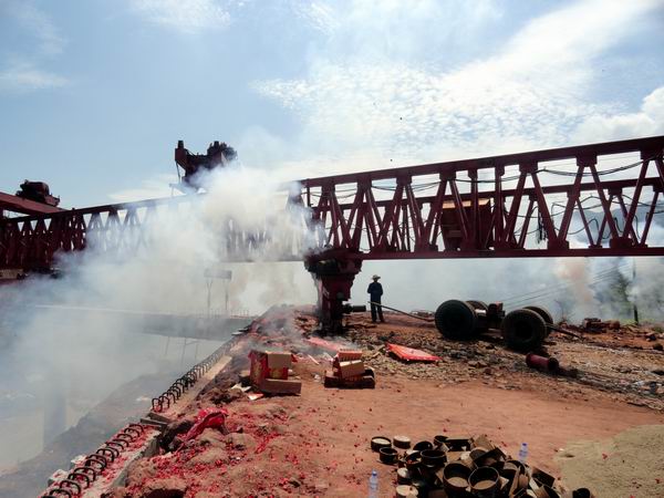 上午10點30分,項目辦、高駐辦等相關領導,在公司總經理助理丁世國、項目經理羅權等的陪同下,親臨我盤石分離立交梁板安裝施工現場指導安裝工作。10點40分,架梁工作正式開始,現場頓時鞭炮齊鳴、禮花綻放。 10點58分,首片梁板順利安裝。