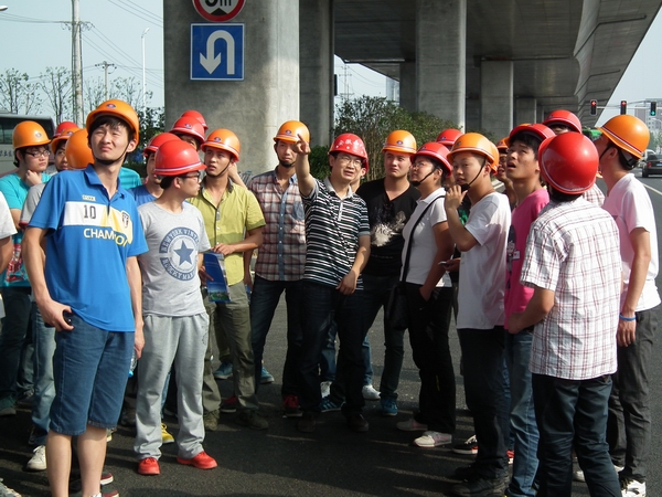 下午15:00,在項(xiàng)目部會議室,該項(xiàng)目總工利用PPT圖文并茂的給學(xué)生們介紹了阜陽北路高架工程概況、施工工藝、工程質(zhì)量控制。隨后,學(xué)生們來到施工現(xiàn)場,該項(xiàng)目總工將學(xué)校中學(xué)習(xí)到的理論知識與現(xiàn)場施工實(shí)際相結(jié)合,對阜陽北路高架橋梁的整個施工工藝流程作了深入淺出的講解。